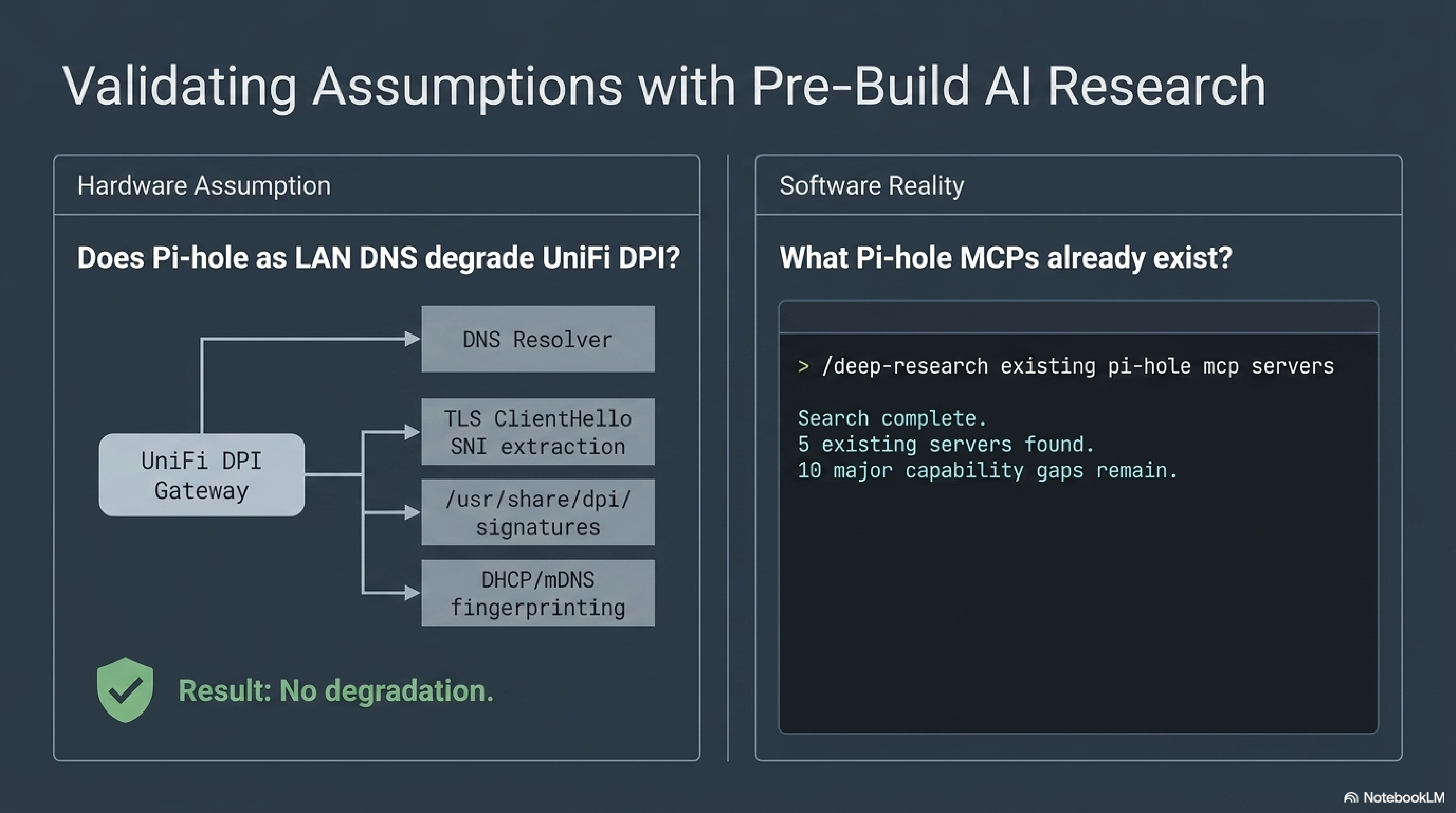The research agent searched Ubiquiti community threads, the Pi-hole discourse, r/Ubiquiti, r/pihole, r/homelab, and vendor docs. The answer was clear: no. UniFi DPI on a UDM Pro is driven by: