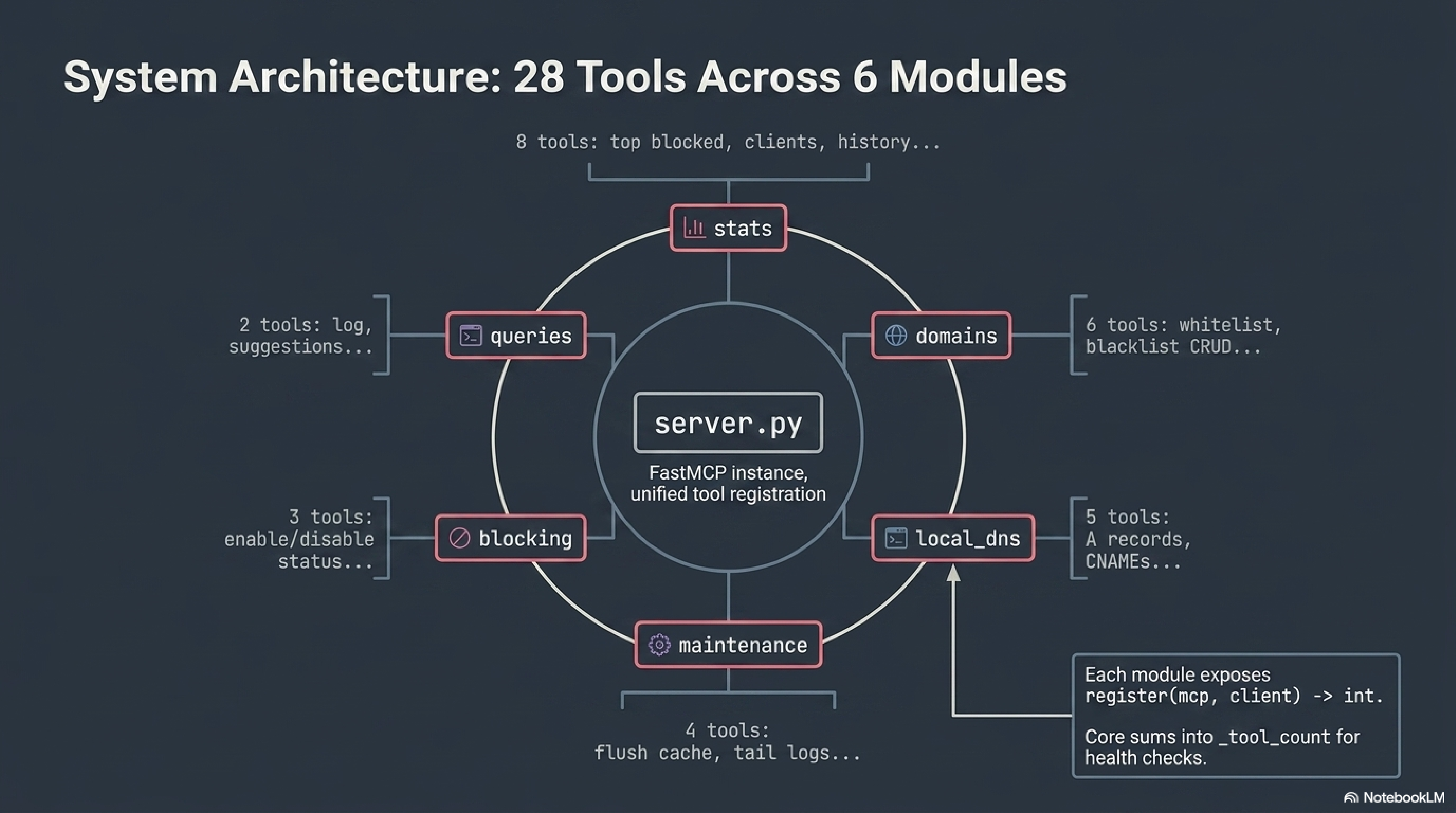 Every tool module exposes a single register(mcp, client) -> int function that decorates tools with @mcp.tool() and returns the count it registered. server.py sums the counts into _tool_count for health checks. Total: 28 tools, plus a meta server_info().
