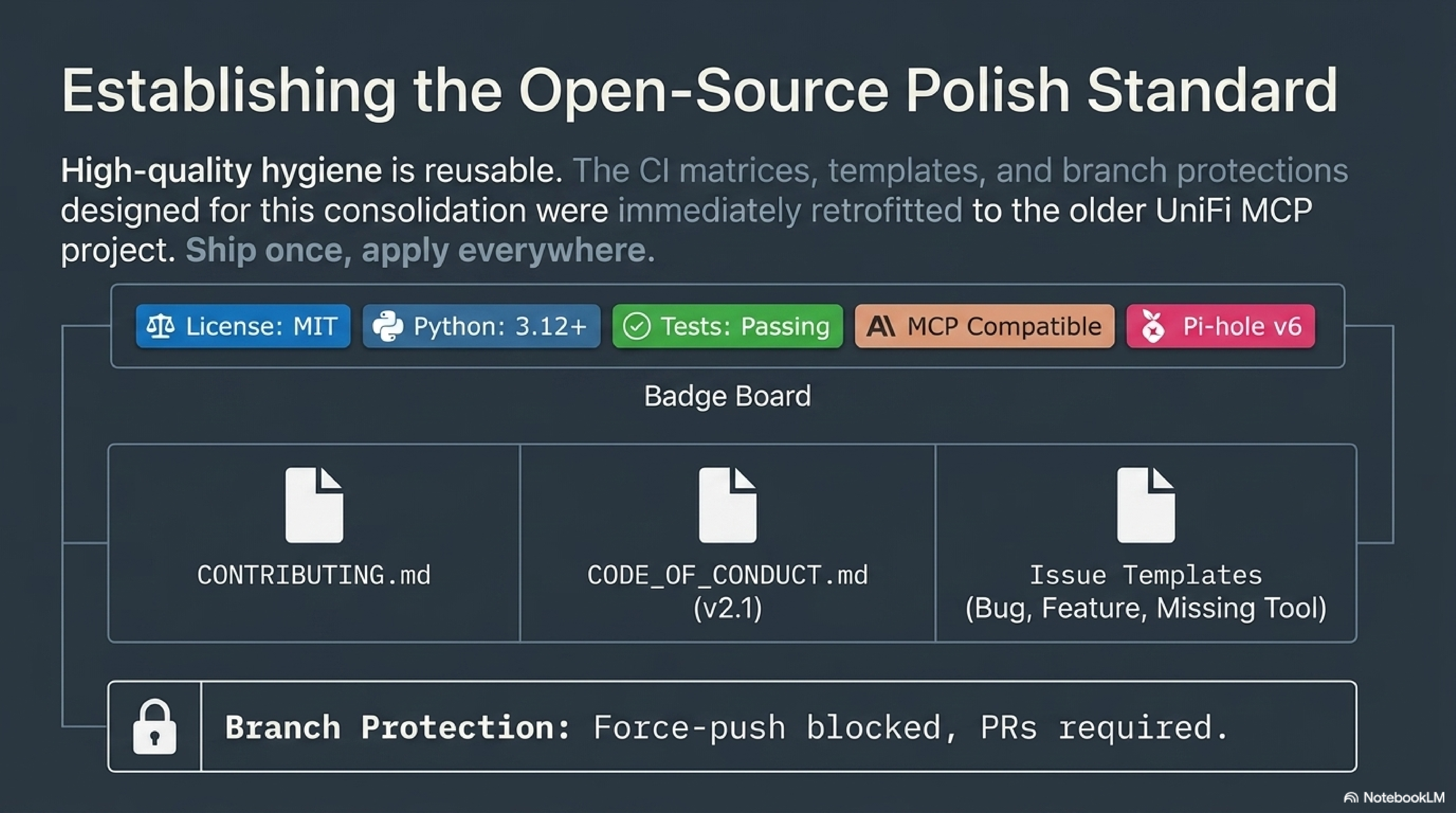 CI, issue templates, CONTRIBUTING, CODE_OF_CONDUCT, branch protection, README badges, topics. Define them once as a ship checklist. Retrofit to every older public repo. Visitors who see consistent polish trust the code before they read it.
