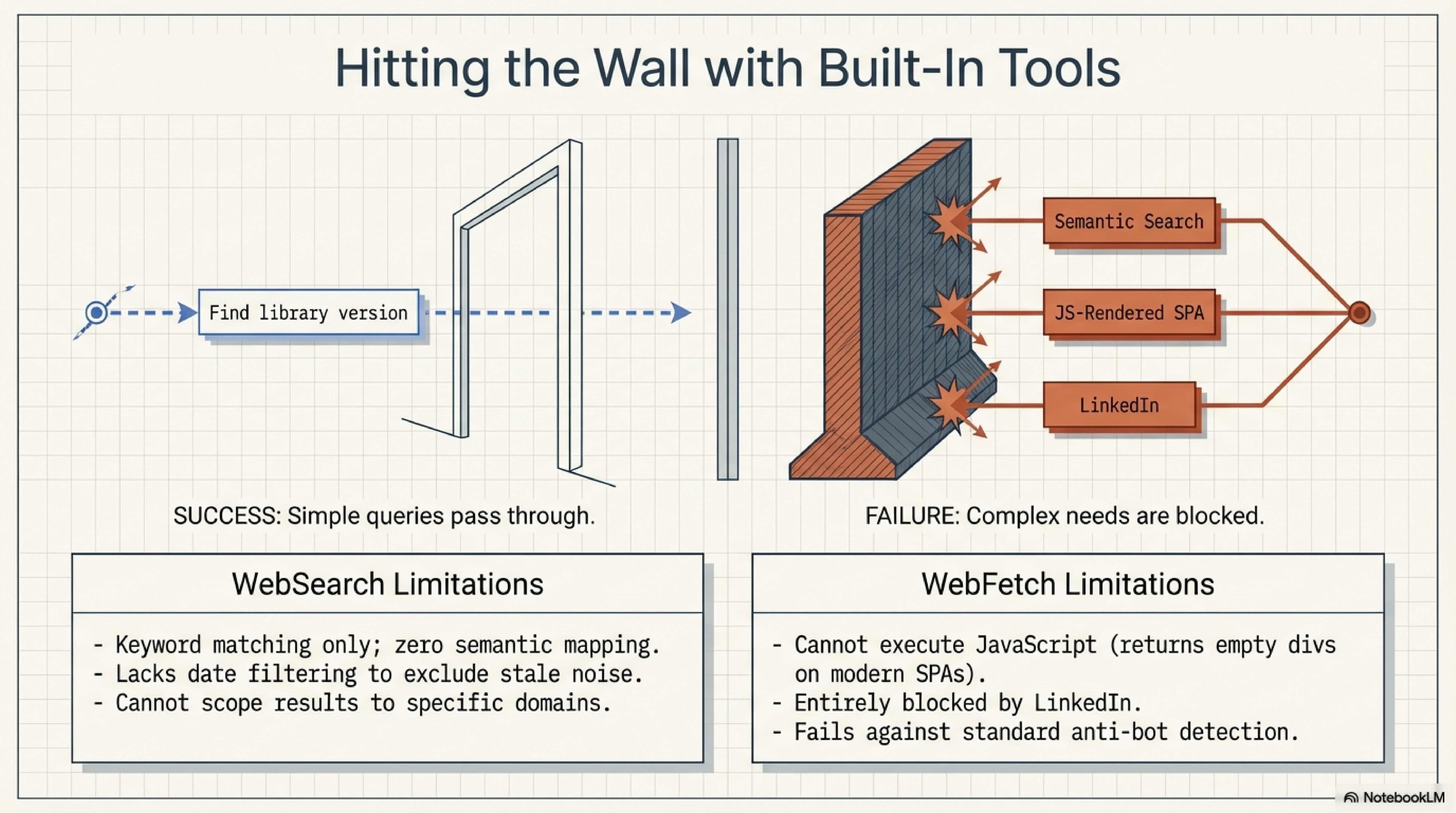 WebSearch returns keyword results without date or domain filtering. WebFetch returns raw HTML without JavaScript rendering. If your research target is a modern web app, a LinkedIn post, or anything behind bot detection, these tools return nothing useful.