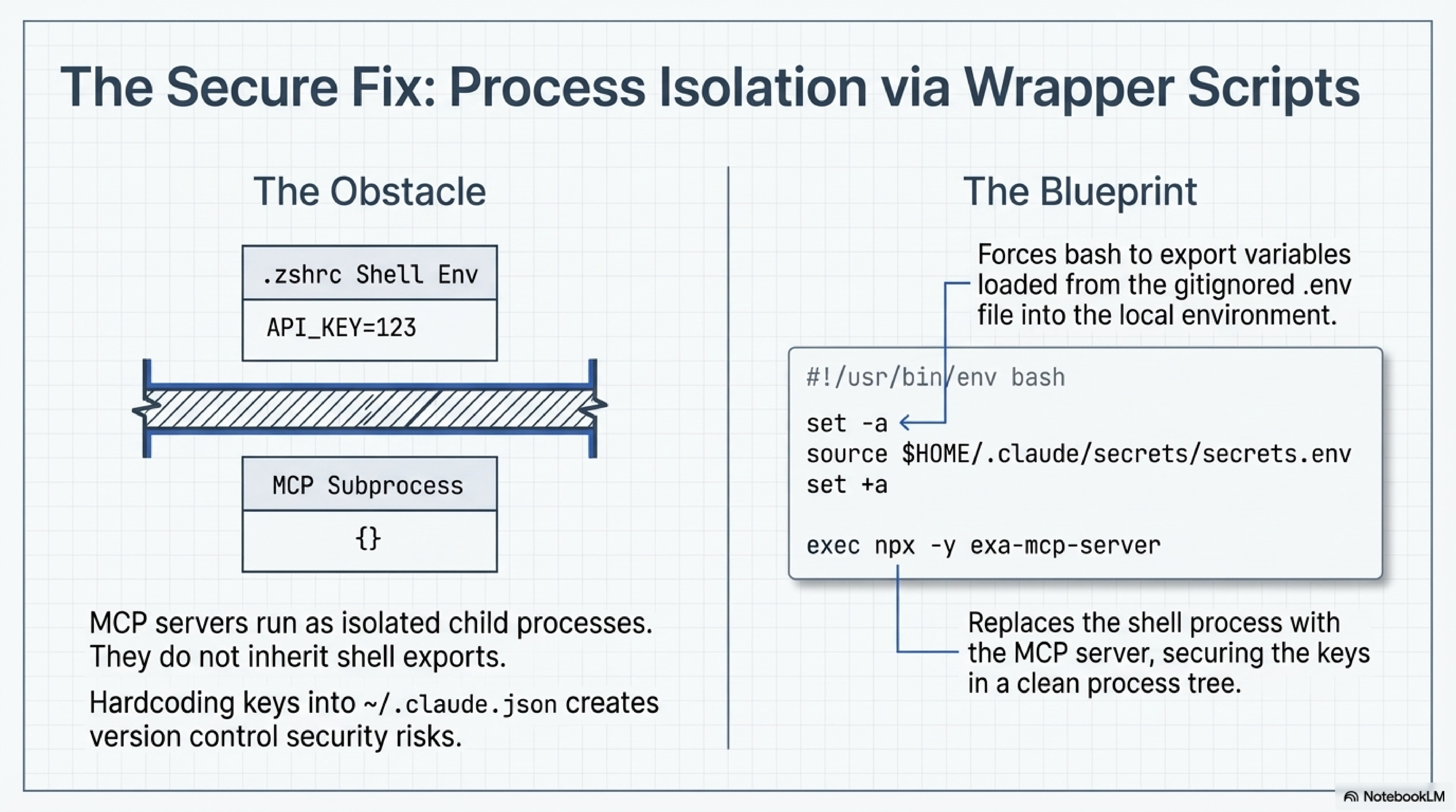 The wrapper script approach works for any MCP server that needs API keys or environment variables. Create a wrapper that sources your secrets file, then exec the actual server command. The keys never appear in ~/.claude.json, and the pattern scales to as many MCP servers as you need.