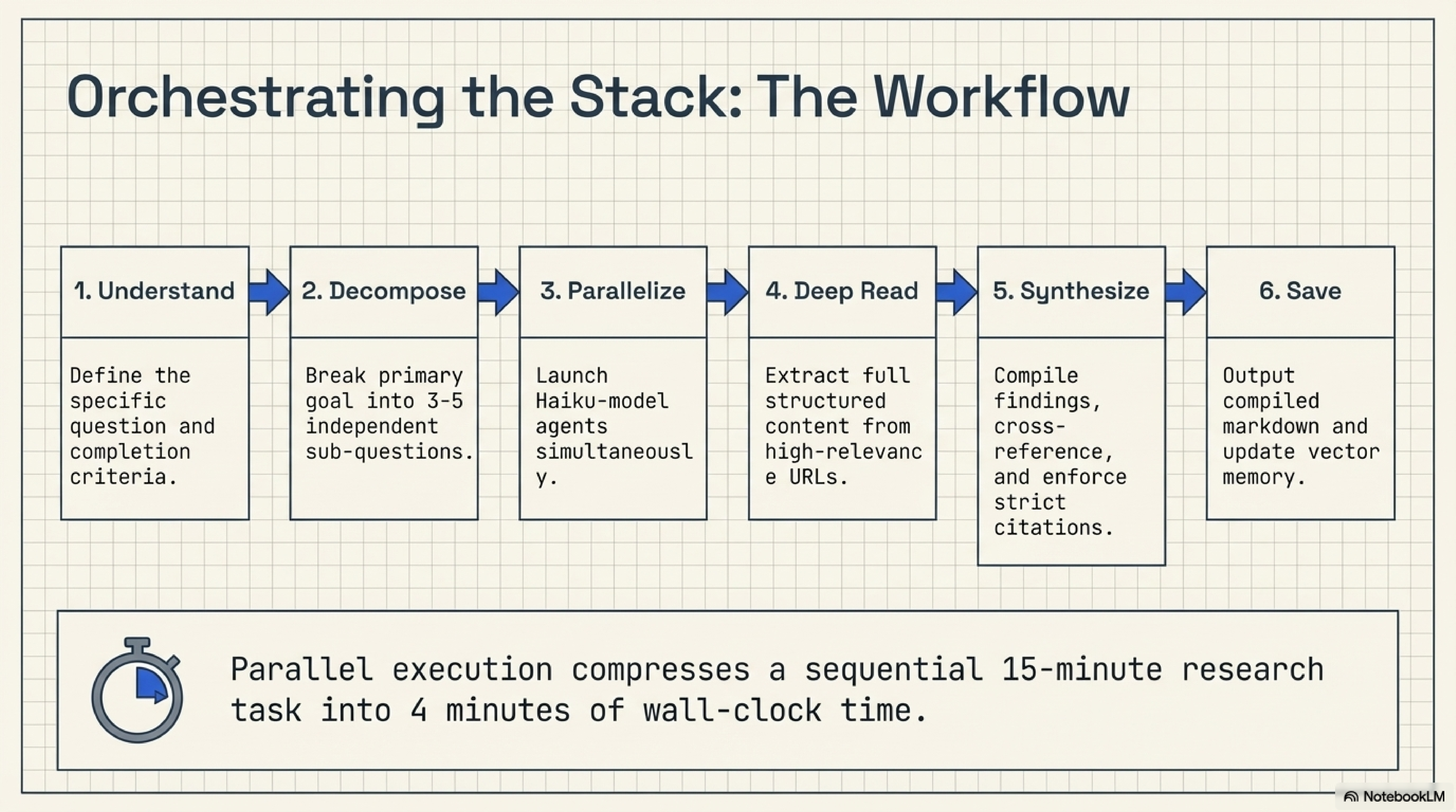 - Parallel research: Launch haiku-model agents in parallel, each investigating a sub-question using Exa as the primary tool and Firecrawl for JS-heavy sources.