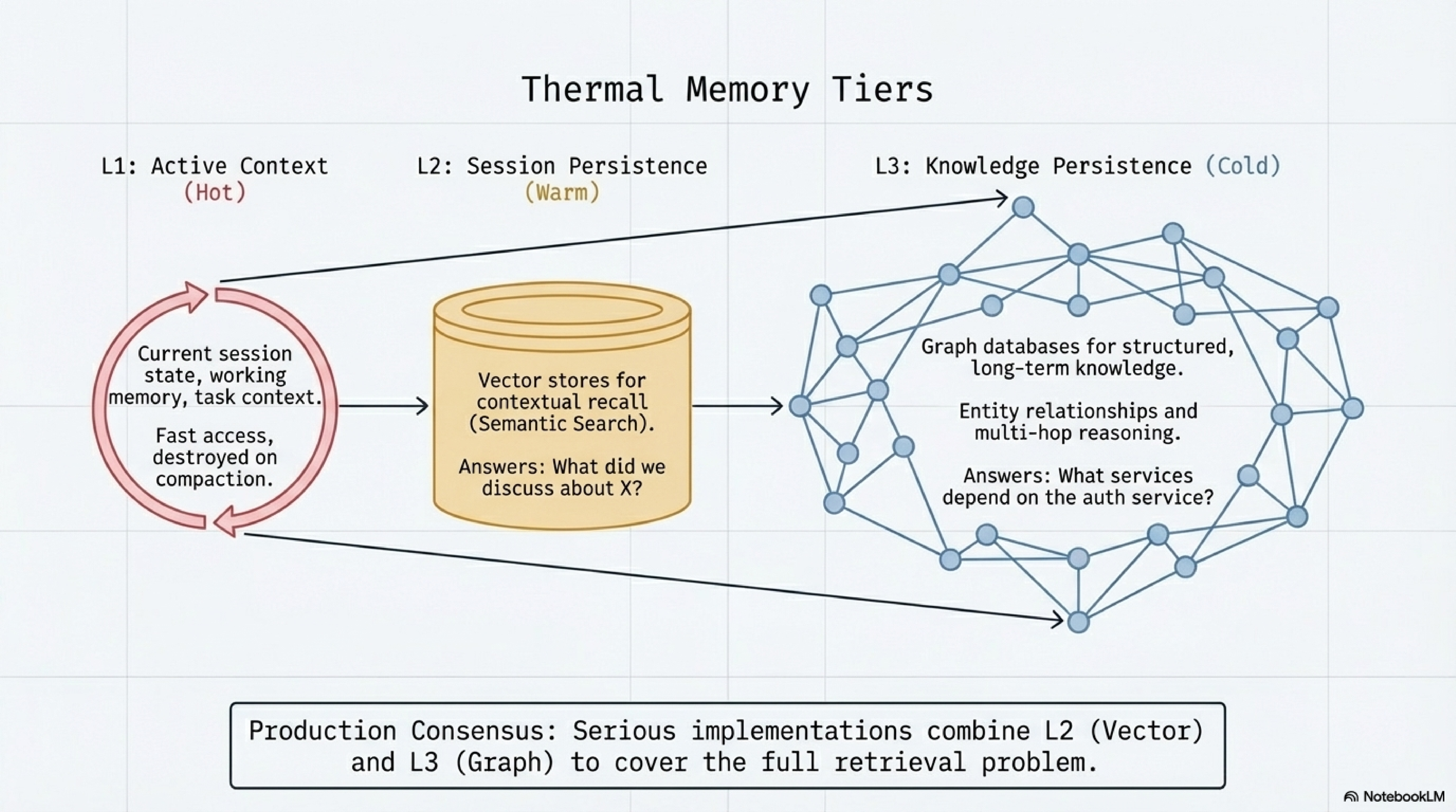 L3: Knowledge Persistence (Cold). Graph databases for structured, long-term knowledge. Entity relationships, temporal evolution, multi-hop reasoning. "What services depend on the auth service?" requires this layer.