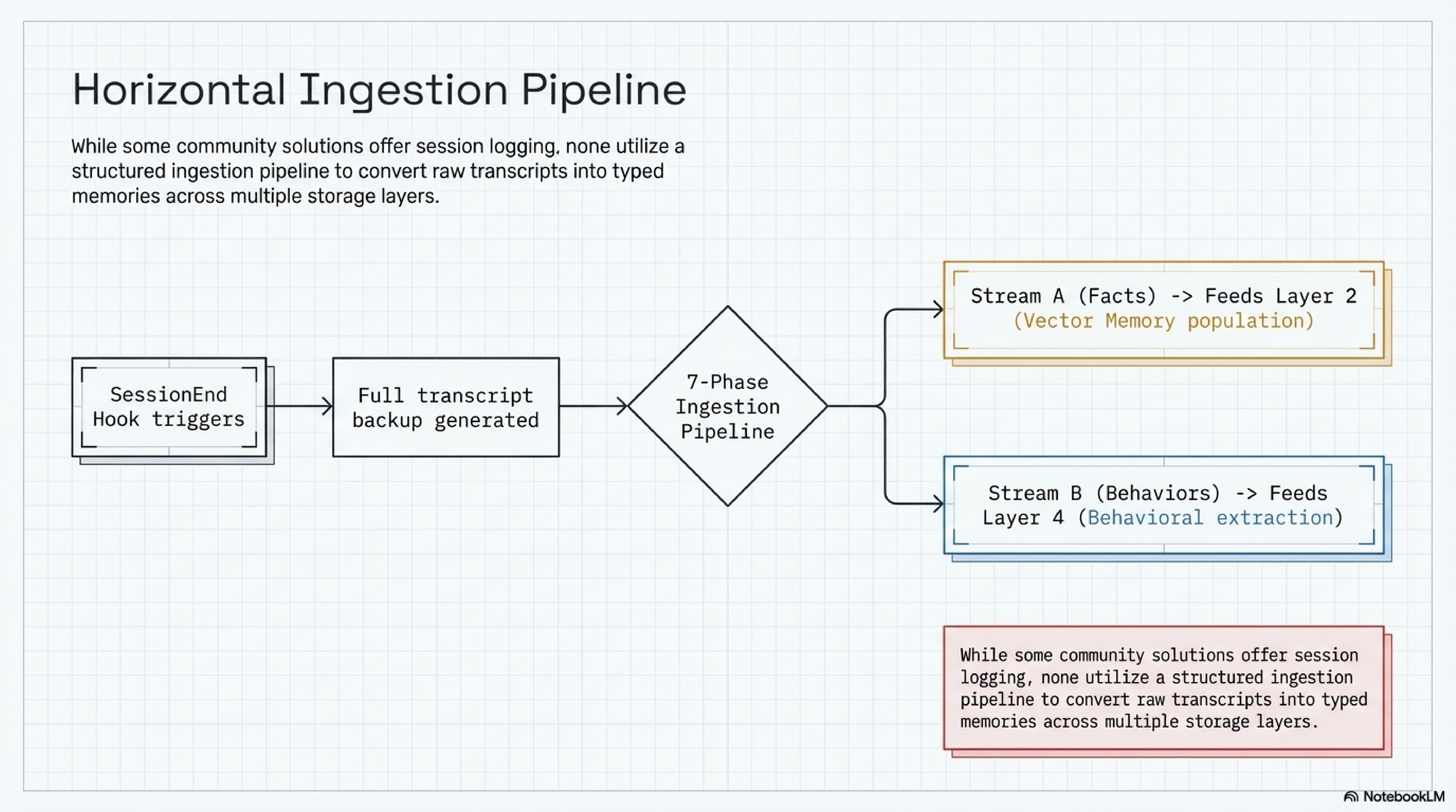 Some community solutions have session logging. None have the structured ingestion pipeline that converts raw transcripts into typed memories across multiple storage layers.