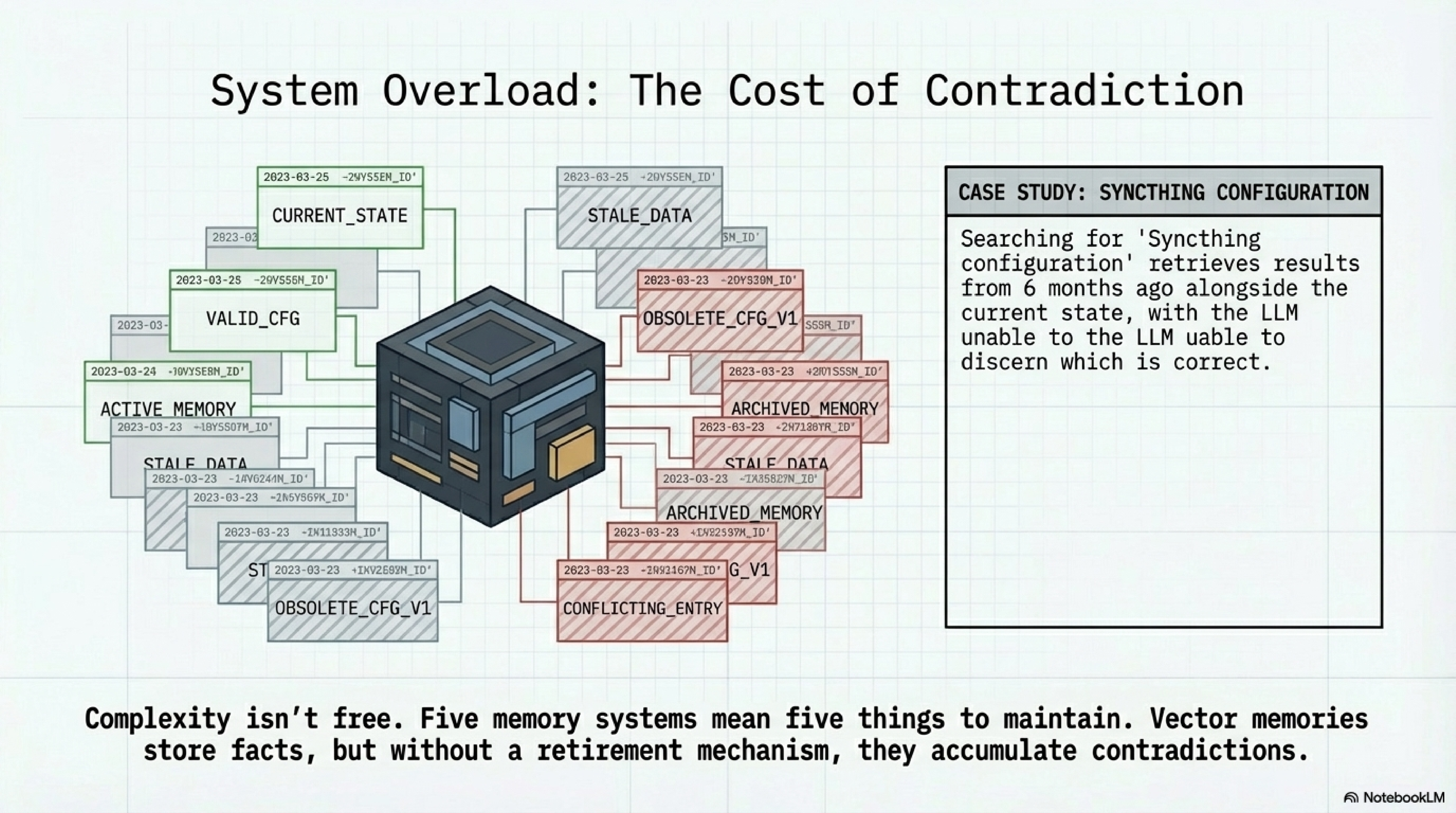 Complexity isn't free. Five memory systems means five things that can break, five things to maintain, and five things consuming context budget at startup. The audit found real problems: stale memories, ghost documentation, duplicate entries. These are maintenance costs that simpler architectures don't pay.