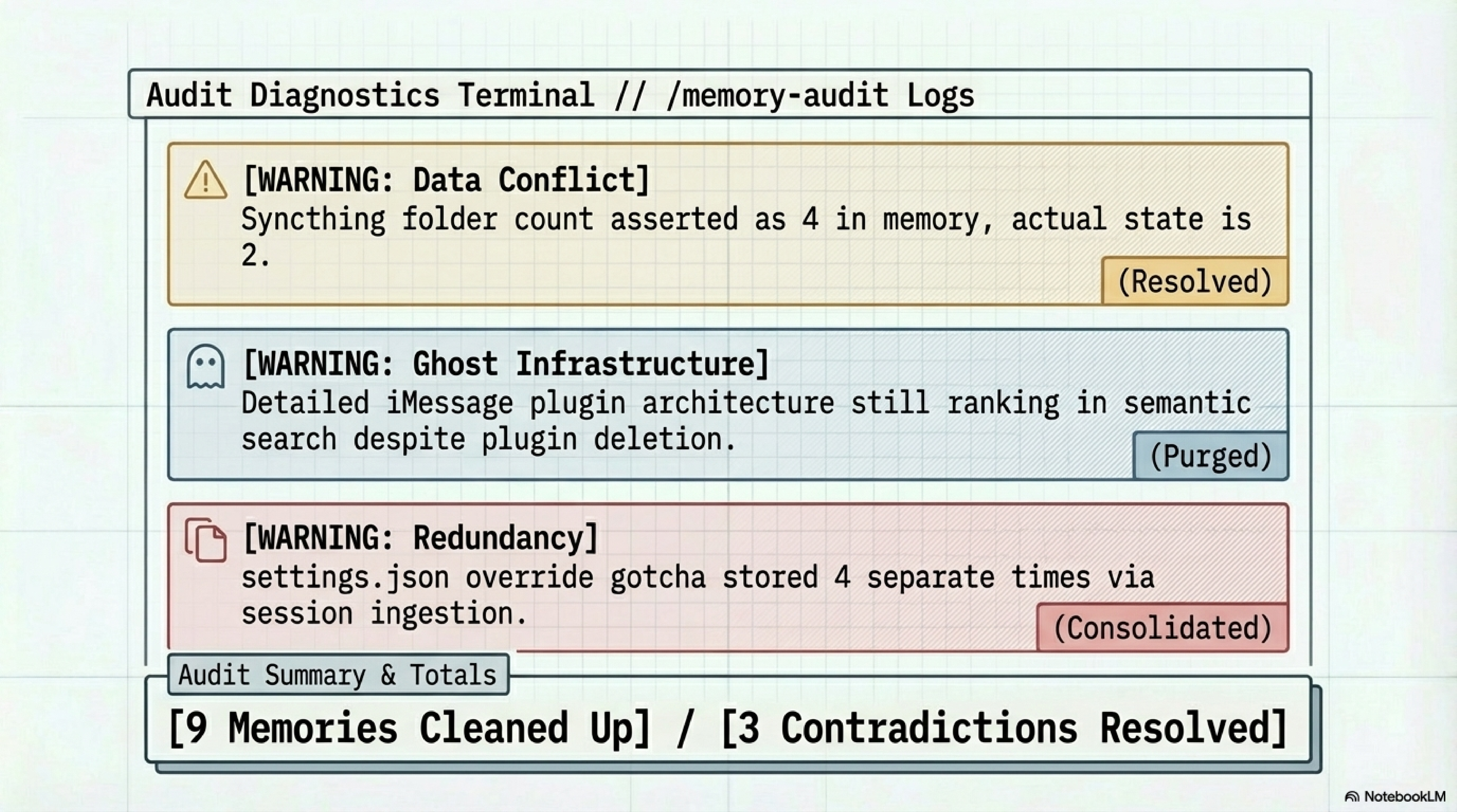 Fact versioning prevents future accumulation. But what about the stale memories already in the system? I built a /memory-audit command that scans vector memory for three types of problems:
