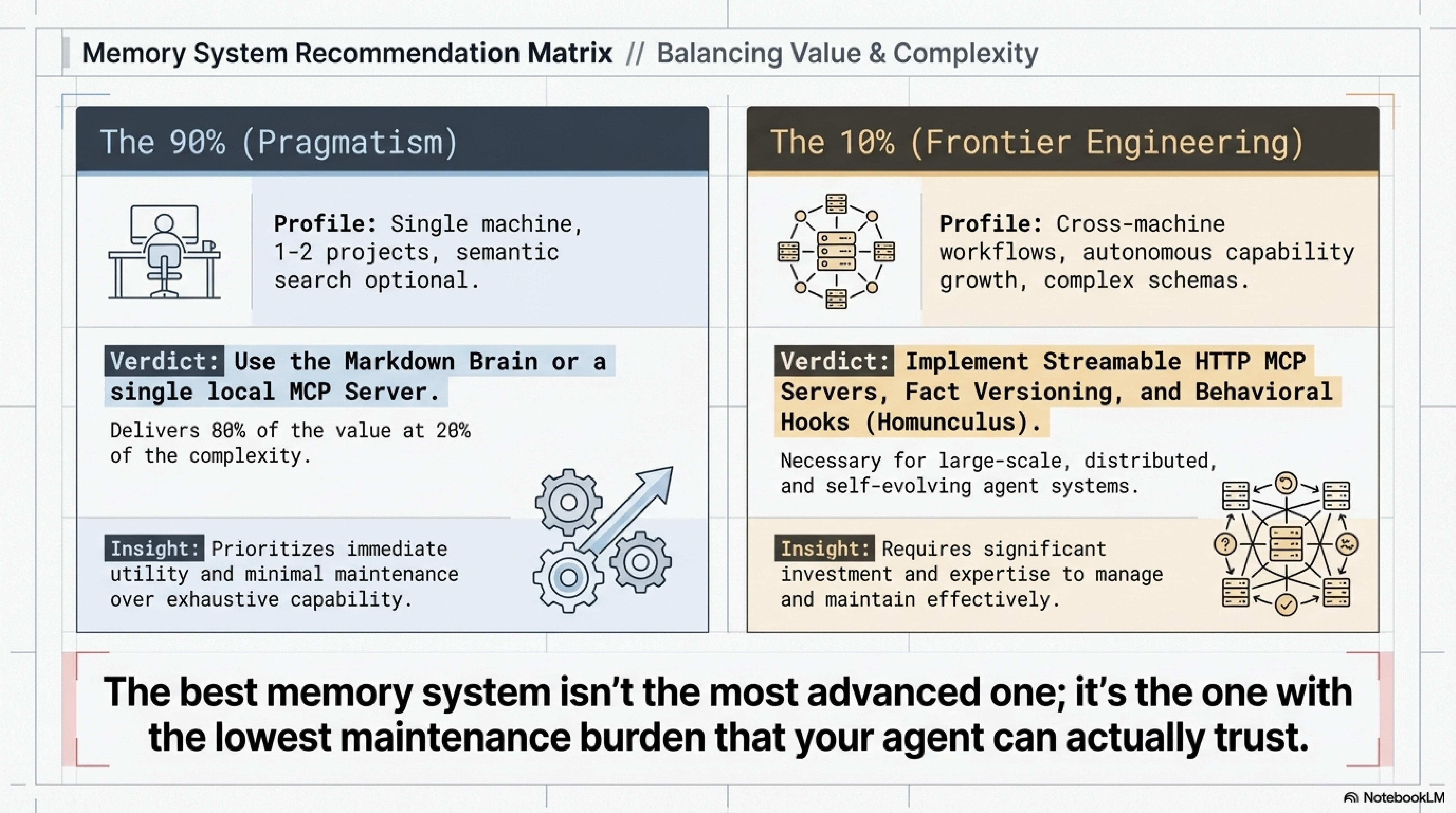 My setup is among the most advanced in the community. But "most advanced" and "best" are not the same thing. For most developers, a single MCP memory server with vector search would deliver 80% of the value at 20% of the complexity. What pushed me beyond that threshold was specific needs: cross-machine development, automated behavioral learning, and the engineering curiosity to see how far you can take it.
