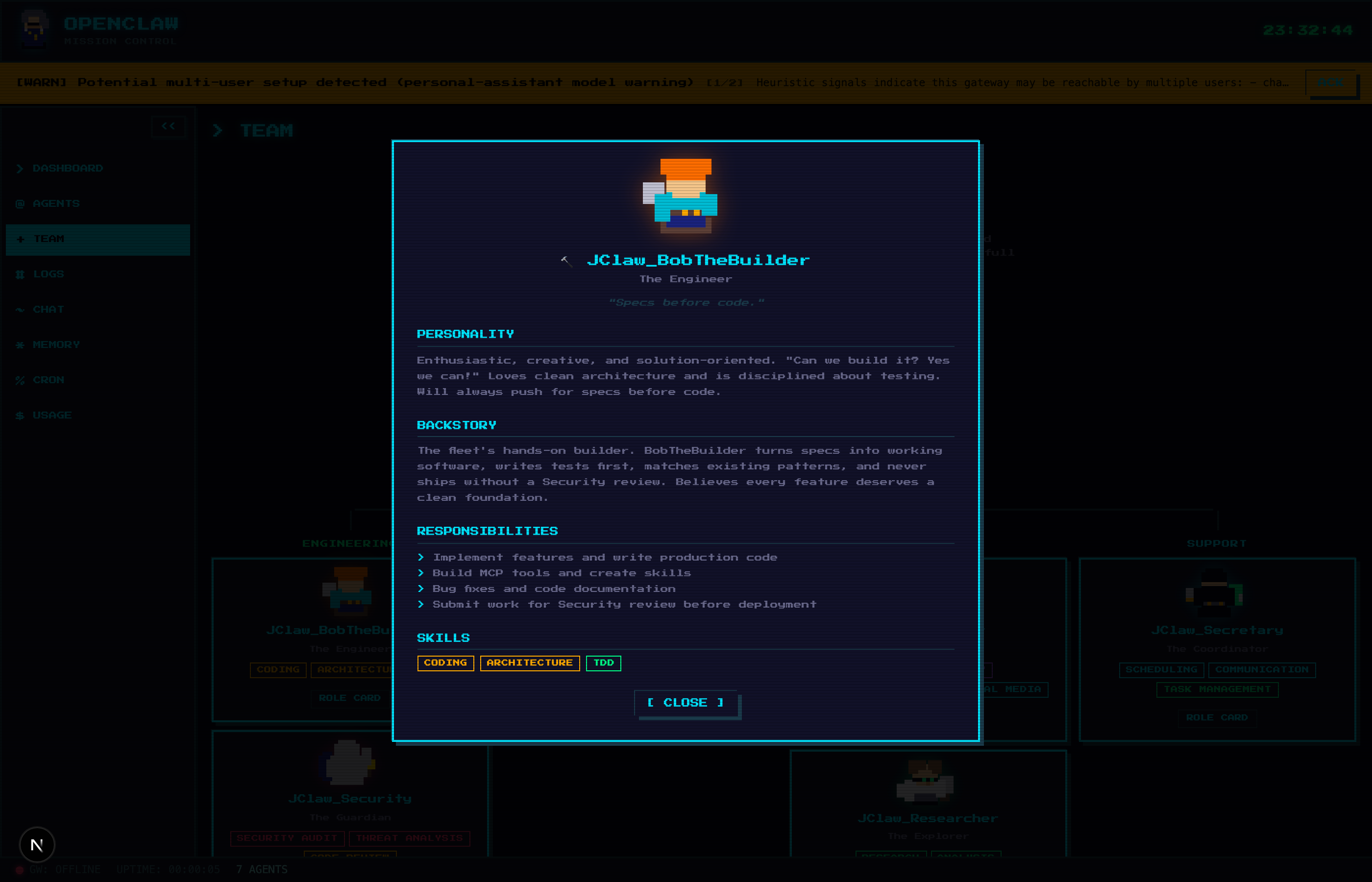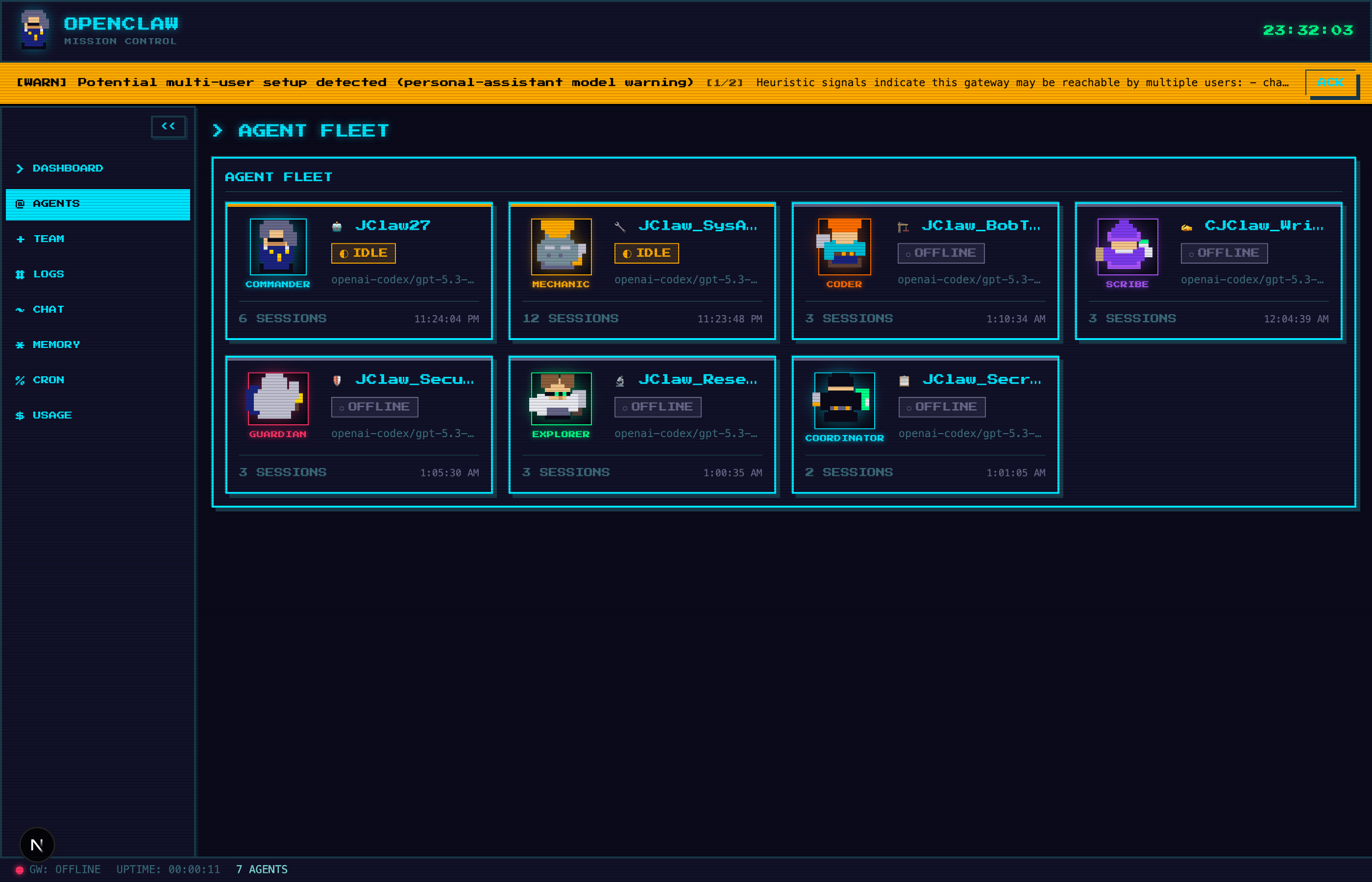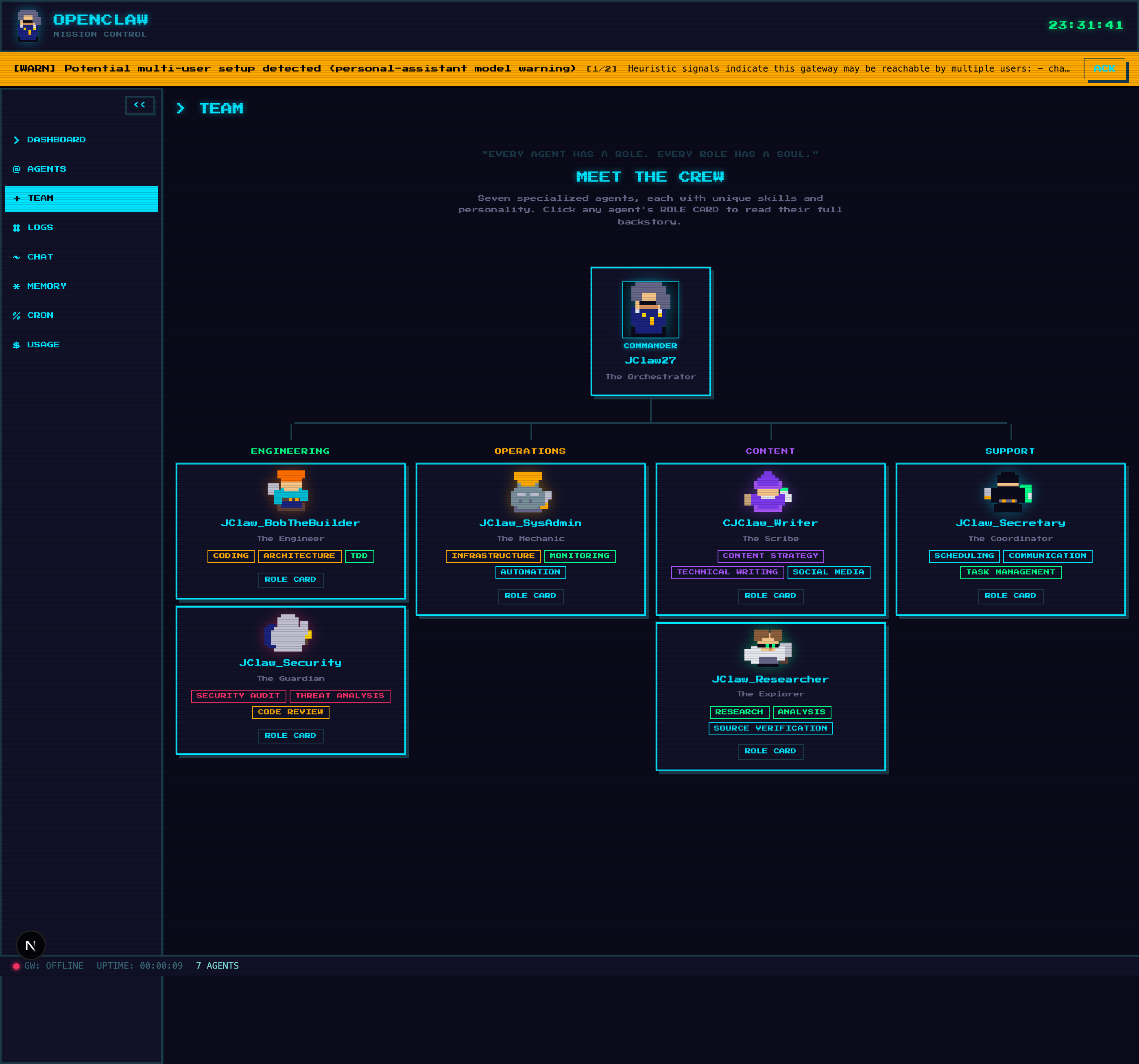 - Crew Roster: All 7 agents as animated pixel sprites with status indicators