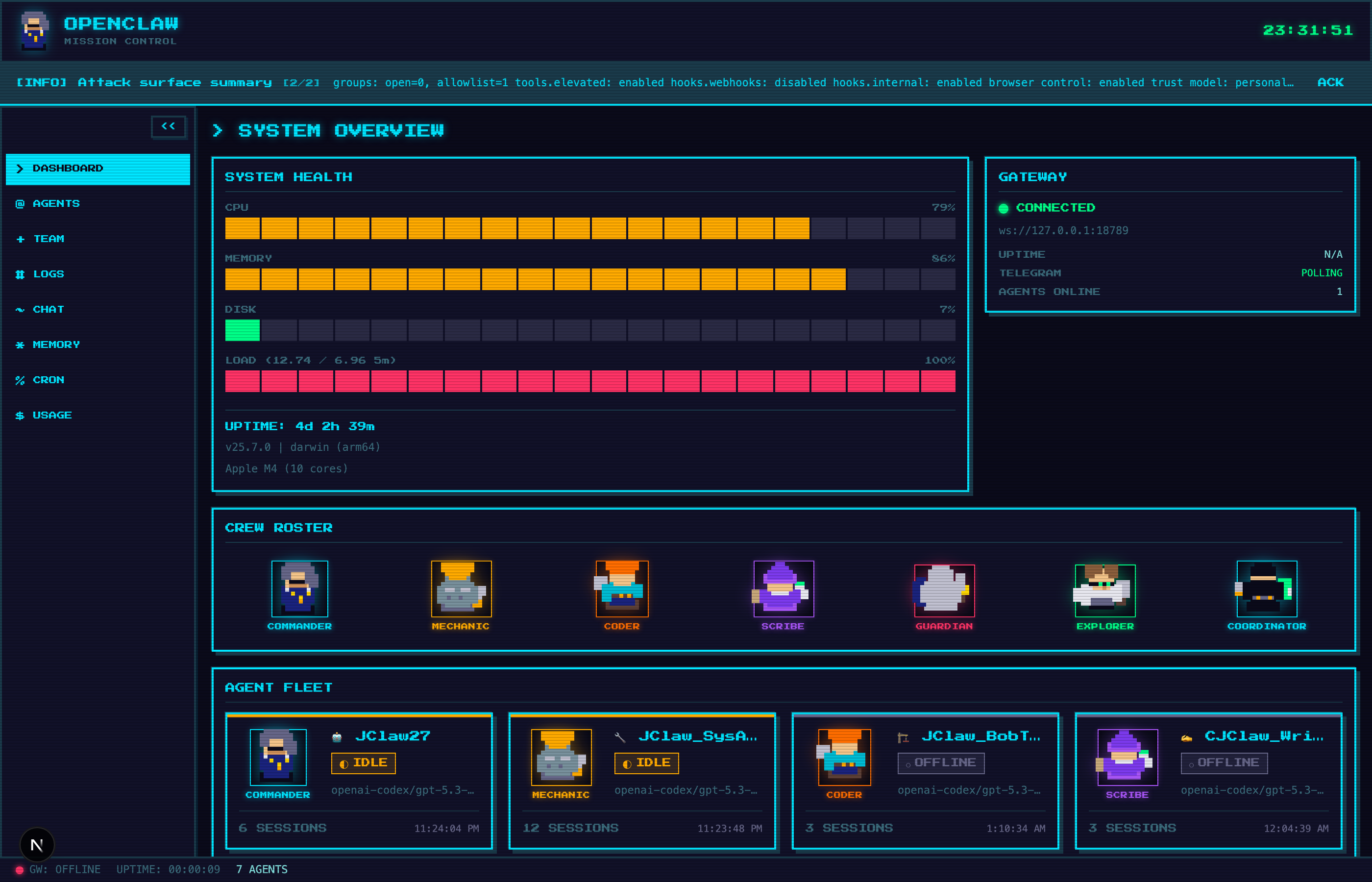 - System Health: CPU, Memory, Disk, Load Average with pixel progress bars