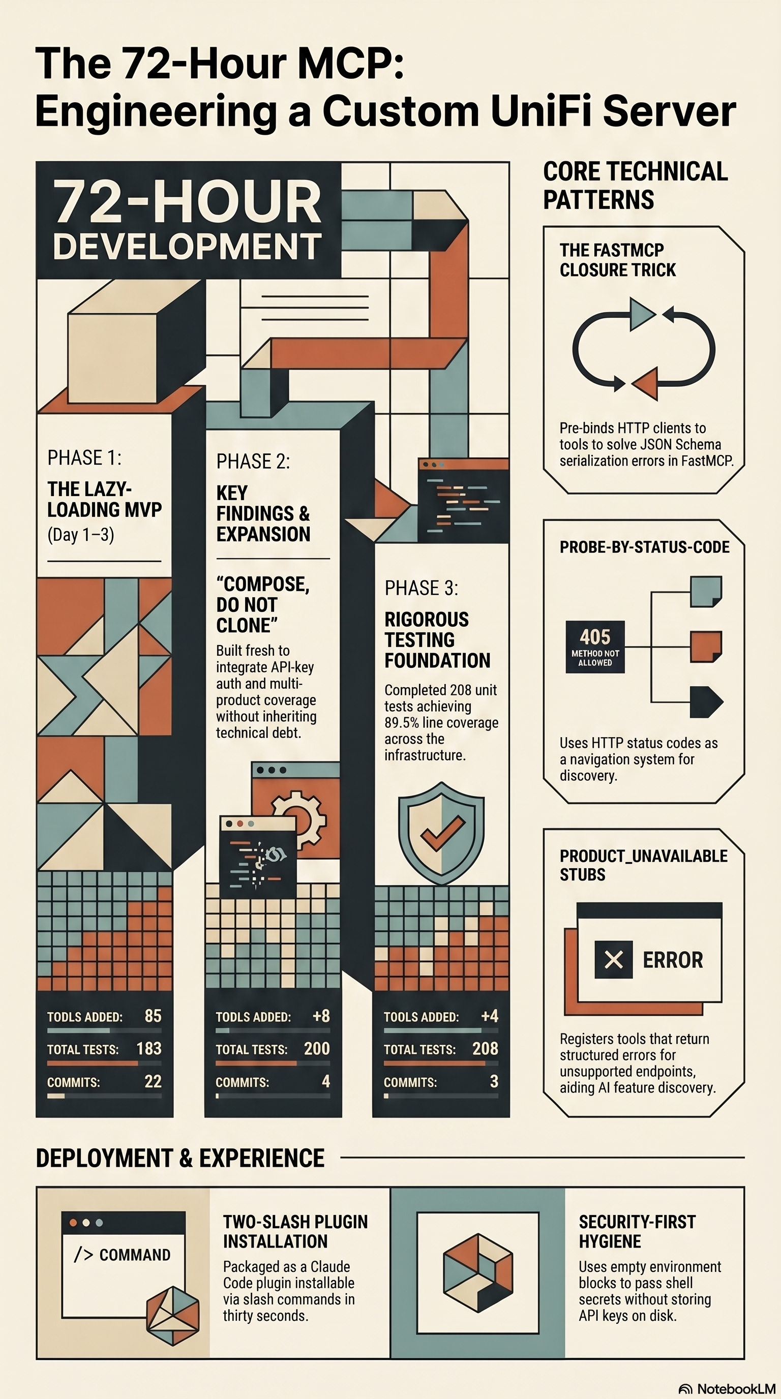 A visual overview of composing a custom UniFi MCP server from two open-source libraries: 103 tools across Network and Protect, the FastMCP closure trick, probe-by-status-code endpoint archaeology, PRODUCT_UNAVAILABLE stubs, and the single-repo plugin marketplace pattern.